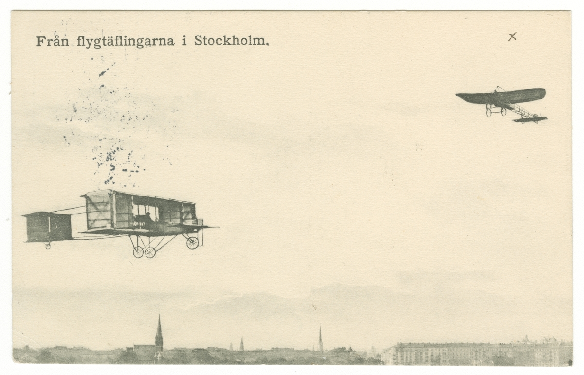 Vykort med fotomotiv från flygveckan i Stockholm i september-oktober 1910. Två flygplan i luften över Stockholm. Danske Robert Svendsen flyger till vänster i flygplan Gräshoppan och svenske Carl Cederström flyger till höger i sitt flygplan "Bil-Bol", av typen Blériot XI.