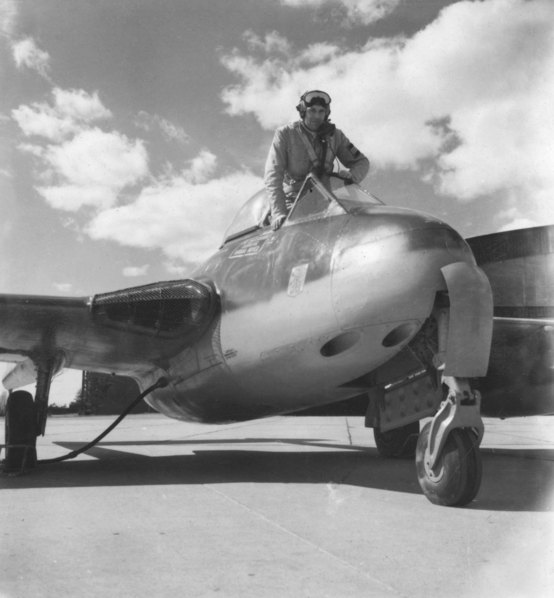Flygdirektör Gunnar von Köhler vid flygplan J 28 på F 3 Östgöta flygflottilj, 1959.