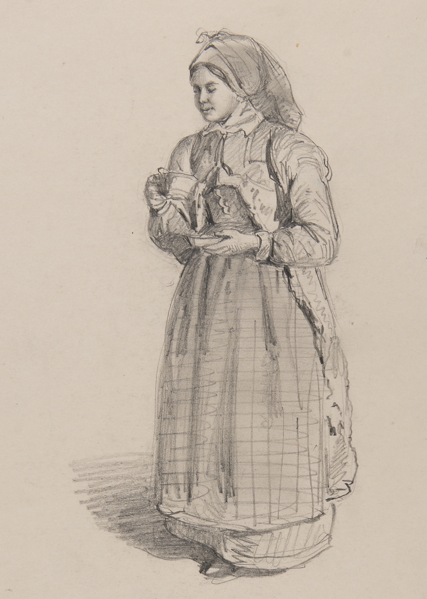 Dräkt. Blyertsteckning kvinna med kaffekopp. av J.W Wallander