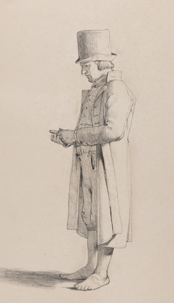 Dräkt".Bonddräng från Qvärlöf" Man i helfigut från sidan. Blyertsteckning i storformat av Otto Wallgren.