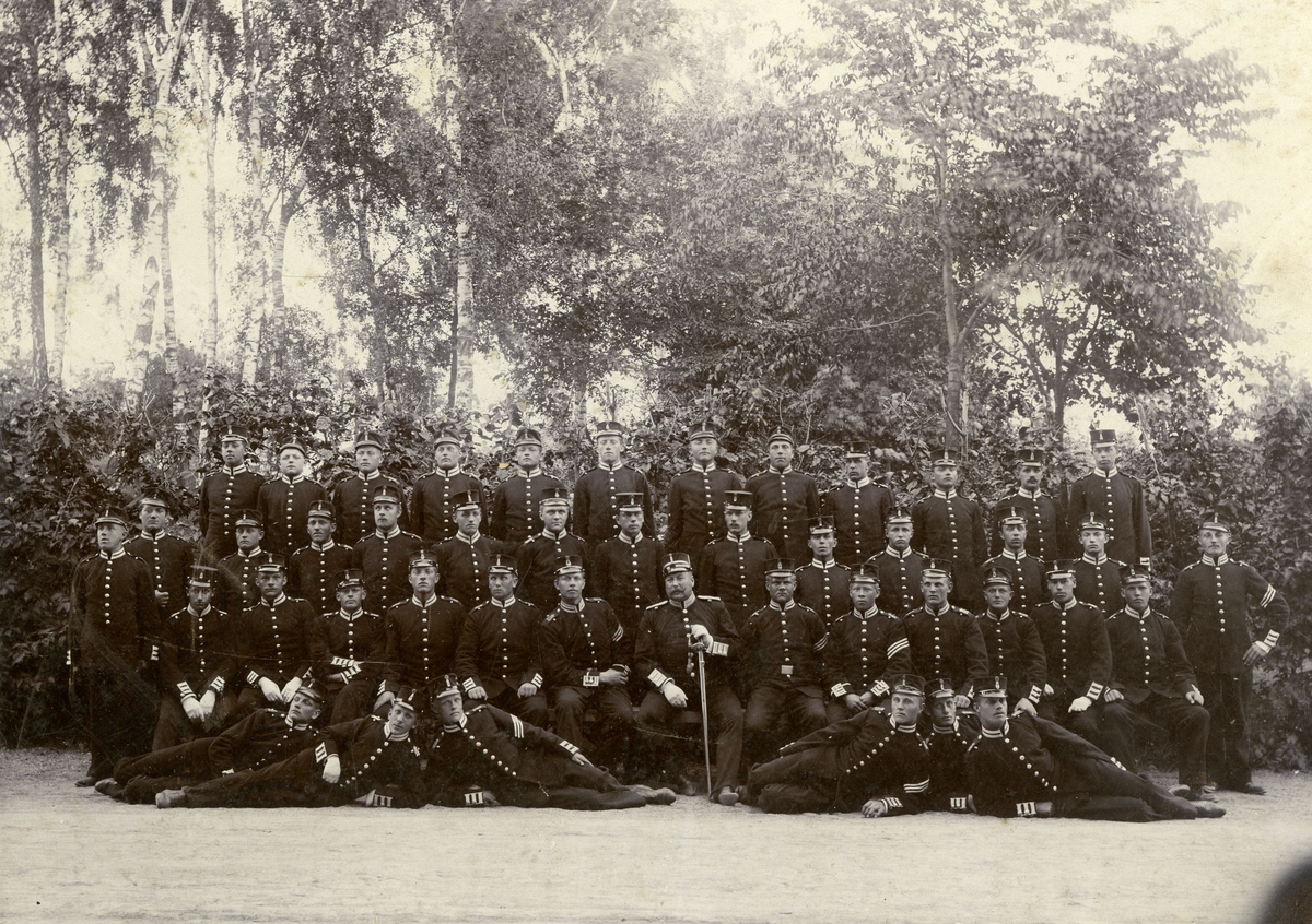 Grupporträtt av soldater förmodligen från Göta livgarde I 2 på beväringsrekrytmötet 1902.