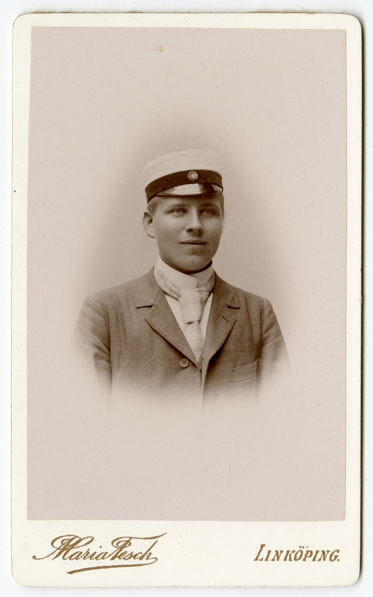Porträtt av August Emanuel Påhlman i studentmössa, sedermera stadsingenjör i Stockholm.