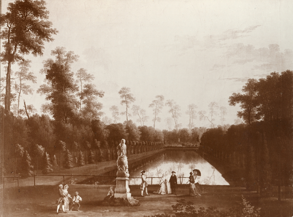 Text i fotoalbum: "Dammen i Karlbergsparken, nuvarande Ridplan från Södra sidan år 1760. Konung Adolf Fredrik använde tidtals Karlberg till lustslott och beställde af målaren Hackert några vyer därifrån, varav två stycken närvarande finnas i Nationalmuseum i Stockholm. Detta är fotografi af den ena af dessa taflan".