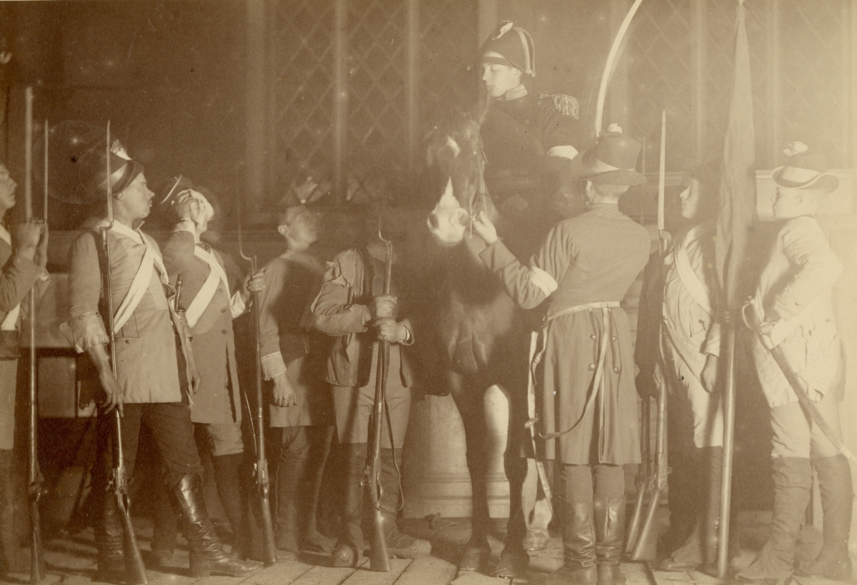 Titel: Scen ur "No femton Stolt" vid manskapsfest i Pontonjärbataljonens exercishus 1891.