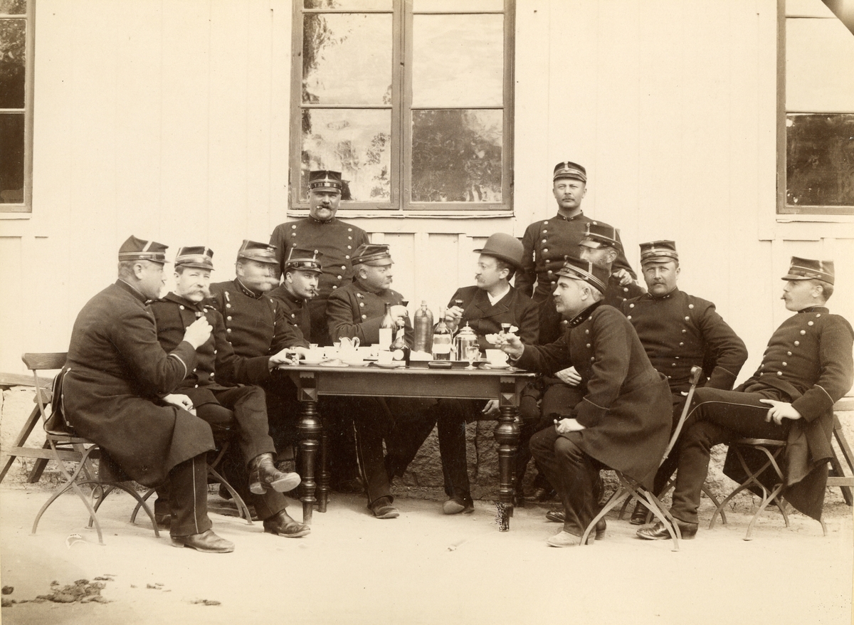 Titel: Officerare sitter vid bordet och dricker kaffe.