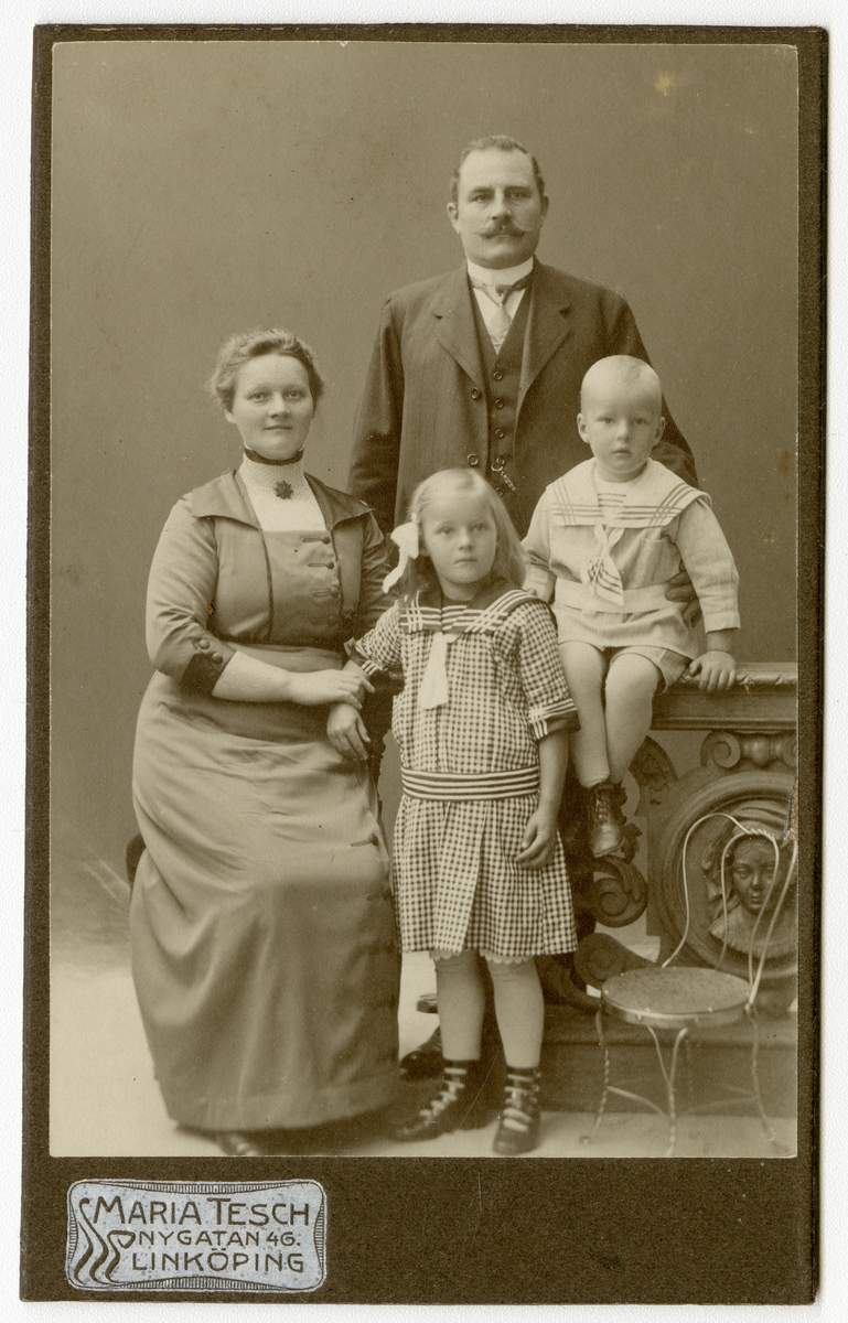 Porträtt av familjen Nilsson med barnen Dagmar och Ingvar.