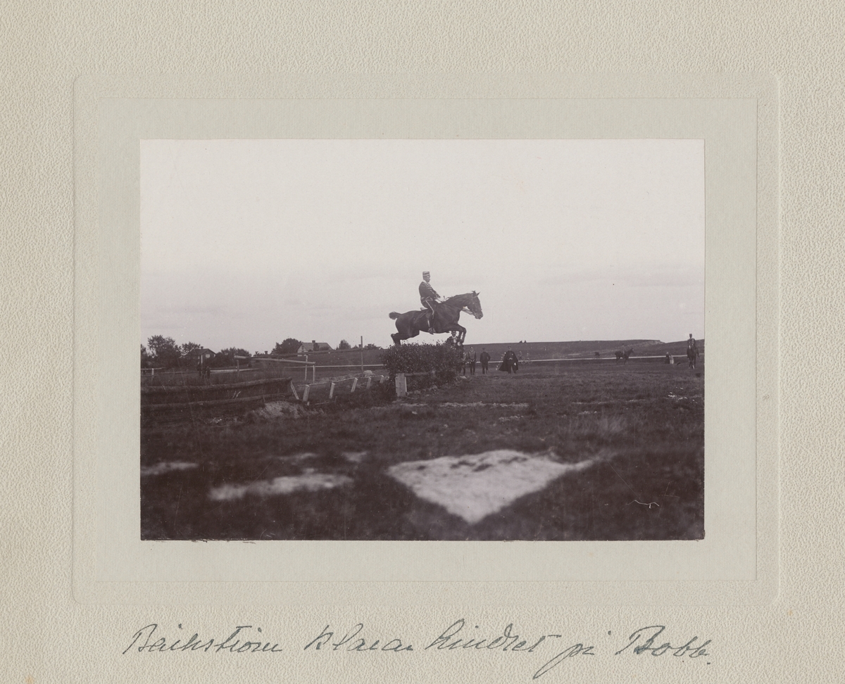 Titel: Officer vid Livregementets husarer K 3 till häst. "Bäckström klarar hinder på Robb".