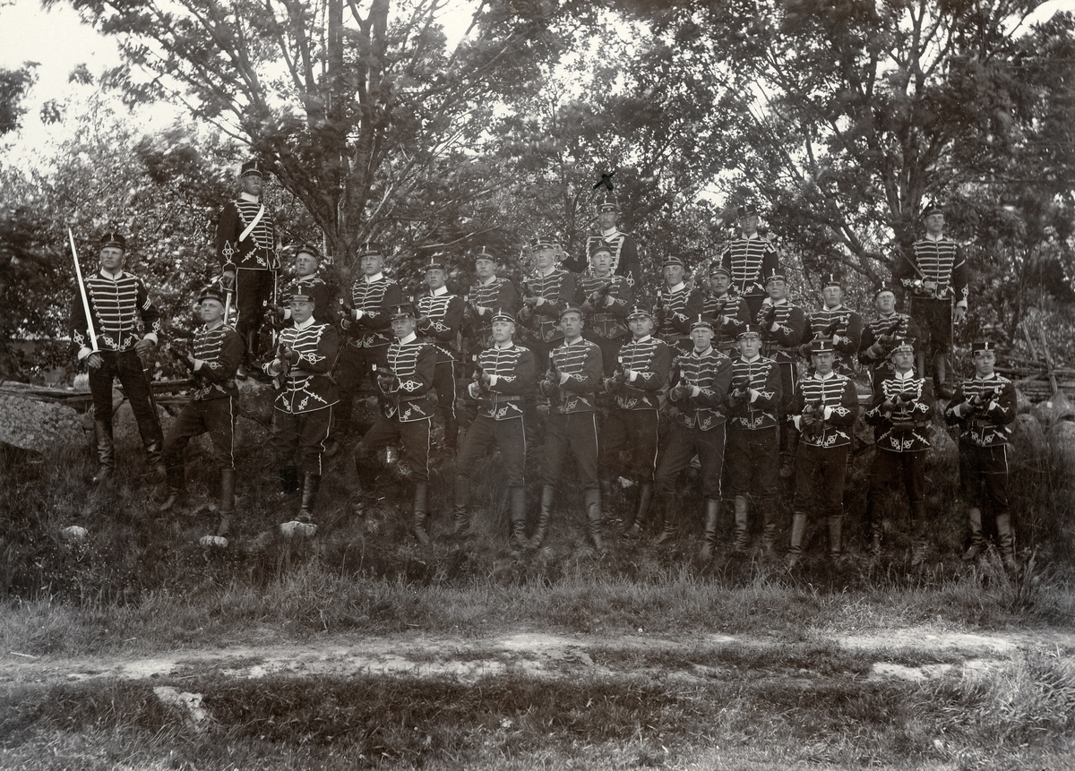 1. Troppen, 3e skvadron vid Livregementets husarer K 1 uppställd i skogen och färdig att avfyra salva.
