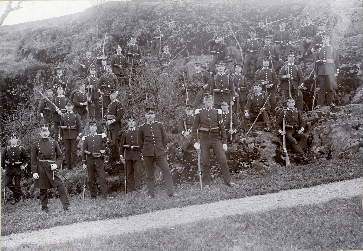 Grupporträtt av officerare och soldater vid Svea livgarde I 1 på Norra djurgården, Ladugårdgärdet 1900.