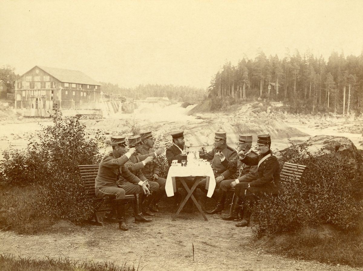 Fortifikationsofficerare och fältläkare med en tysk kollega på kaffepaus, Laxön 1892.