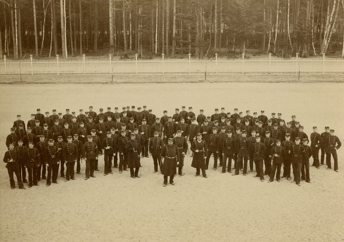 Titel: Grupporträtt av soldater och officerare vid Norra skånska infanteriregementet I 24.