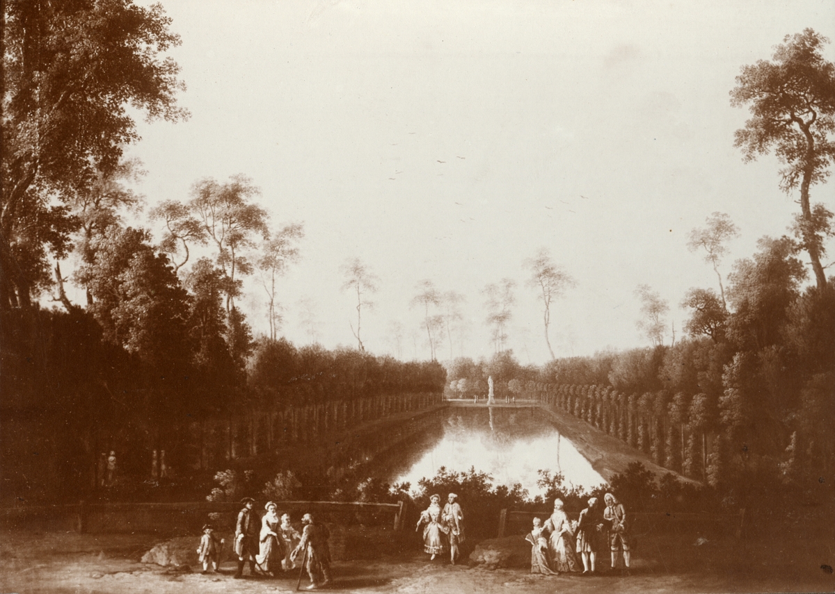 Text i fotoalbum: "Dammen i Karlbergsparken, nuvarande Ridplan från norra sidan år 1760. Konung Adolf Fredrik använde tidtals Karlberg till lustslott och beställde af målaren Hackert några vyer därifrån, varav två stycken närvarande finnas i Nationalmuseum i Stockholm. Detta är fotografi af den ena af dessa taflan".