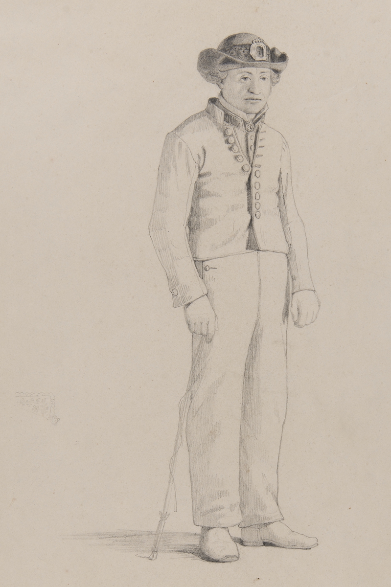 Johan Hansson, Hustorp, Bara Härad. Blyertsteckning av Otto Wallgren. Studie framifrån av man i dräkt , stående i helfigur med beskrivande text