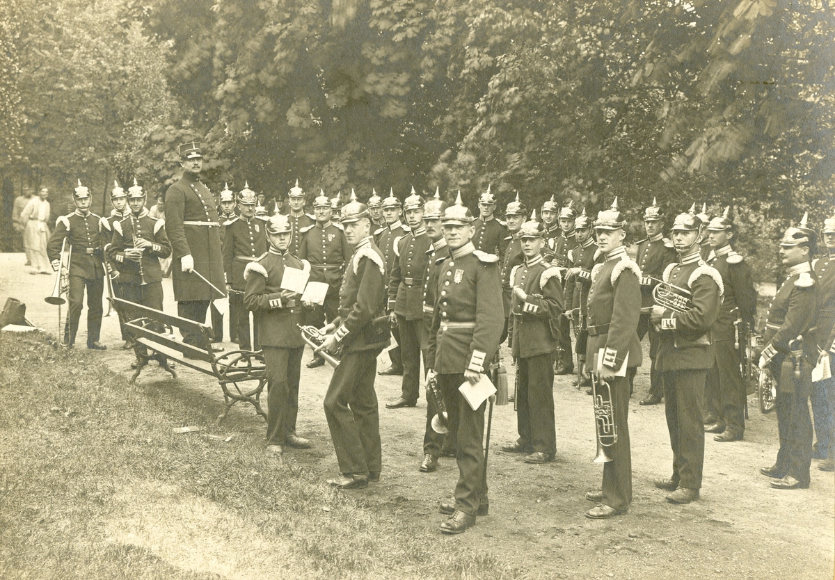 Titel: Grupporträtt av musikkåren vid Göta livgarde I 2 konserterar i garnisonssjukhusets park 1918.