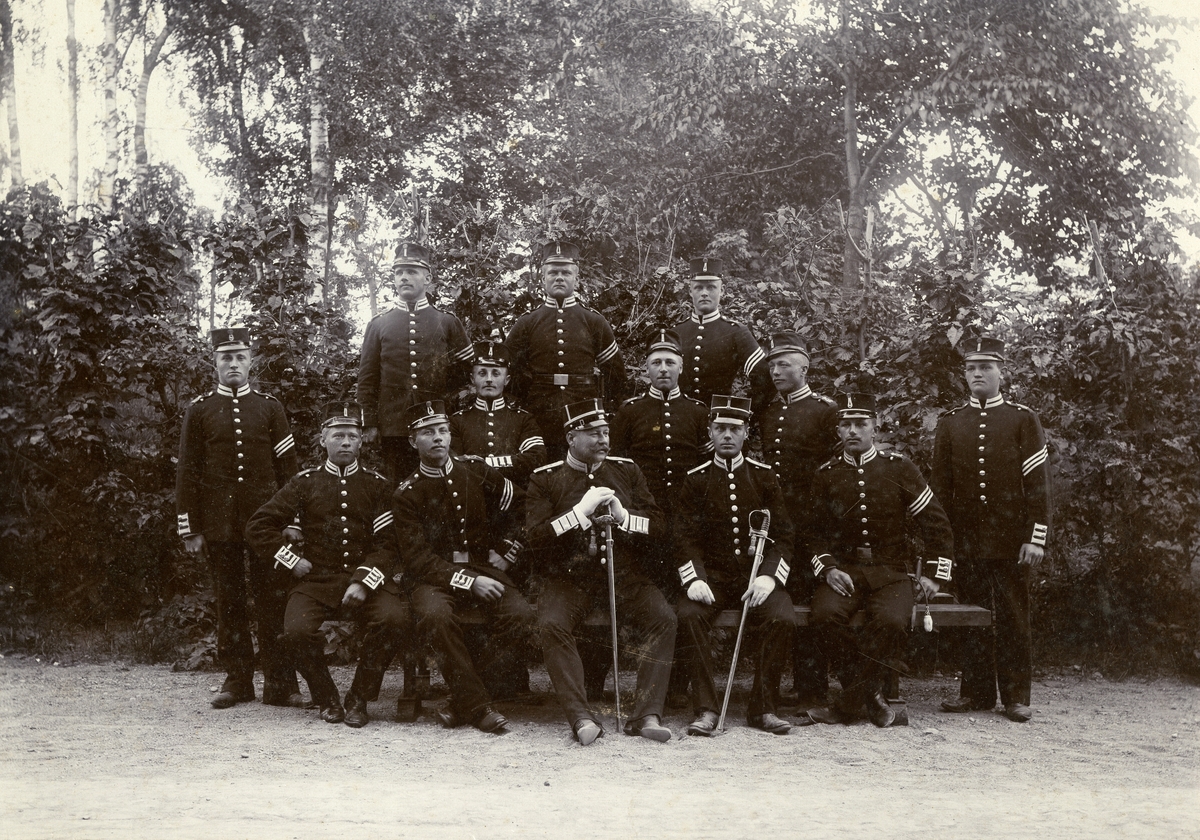 Grupporträtt av officerare och soldater förmodligen från Göta livgarde I 2 på beväringsrekrytmötet 1902.