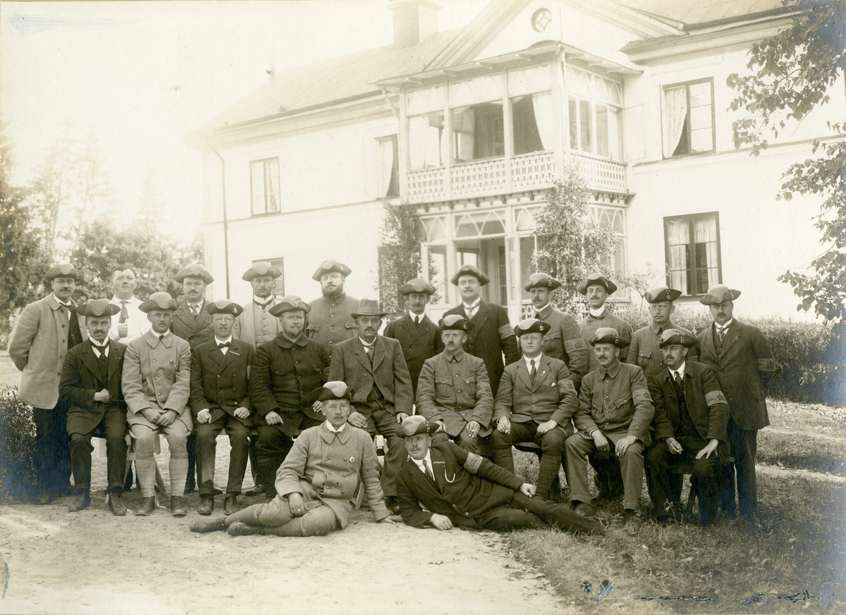 Grupporträtt av landstormens 3:e kompaniet bataljon Almström, landstormsbefäl poserar utanför hus vid Löttinge 1914.