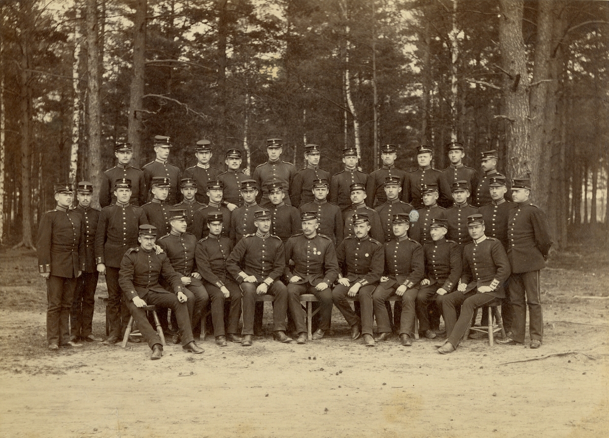 Grupporträtt av officerare vid officersvolontärskolan på Karlsborg 1889-1890.