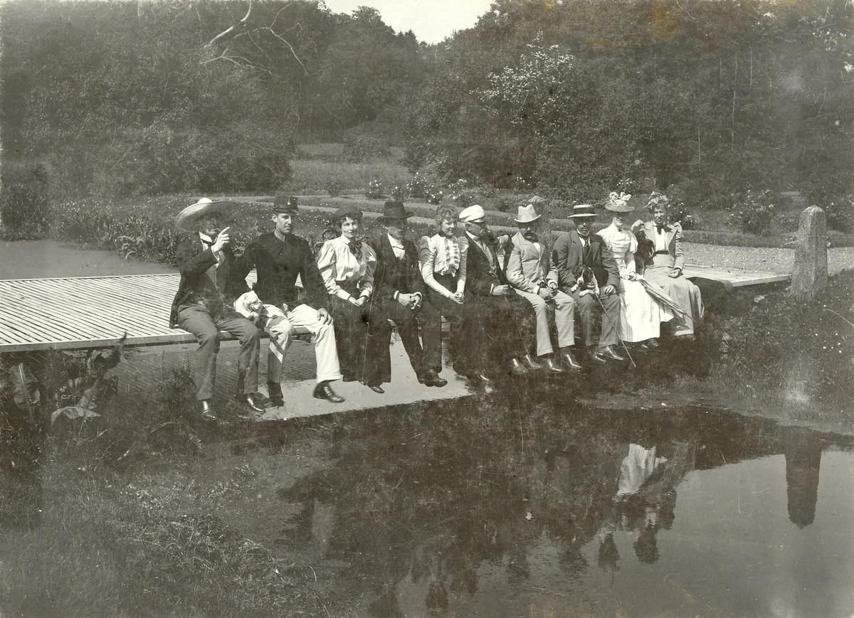 Kvinnor och män sitter på en liten träbro, sommaren 1898.
