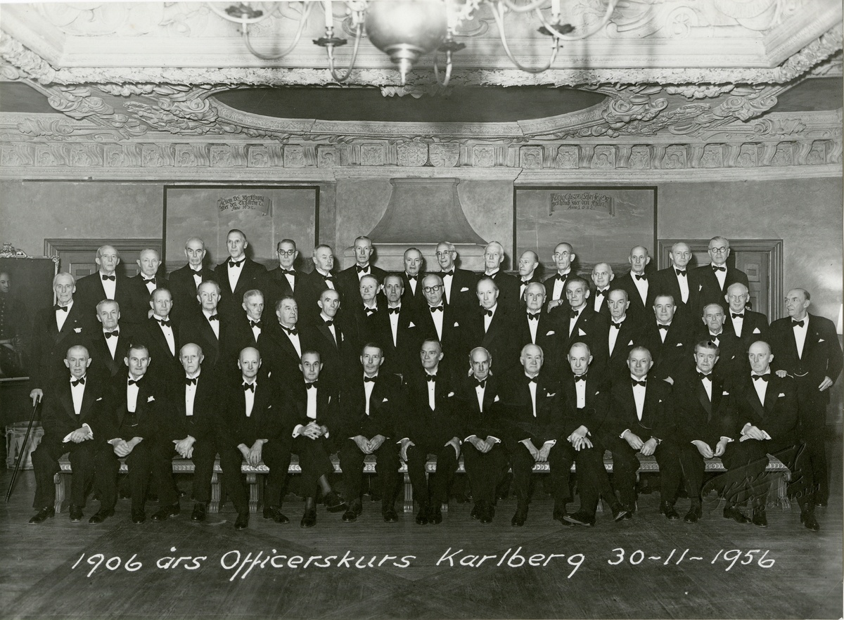 Grupporträtt av officerare från 1906 års officerskurs, Karlberg den 30 november 1956.