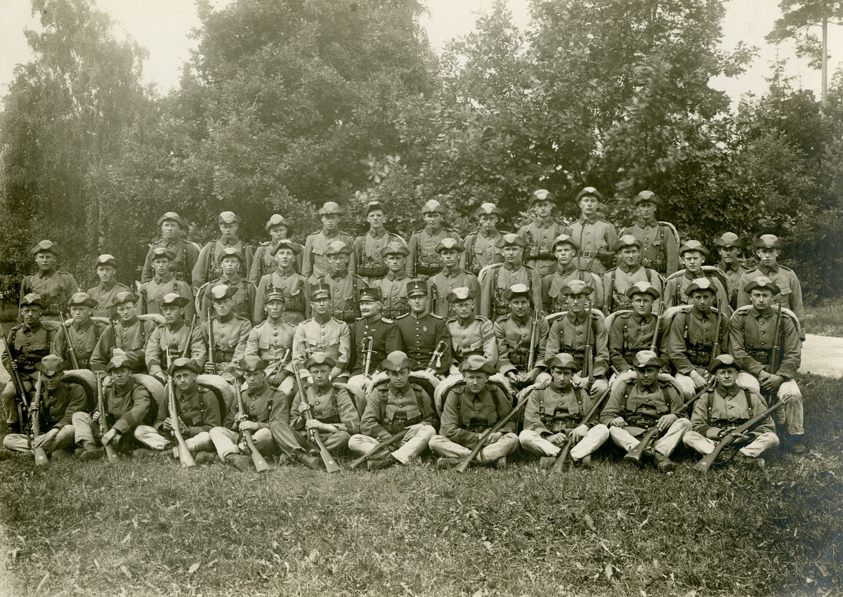 Grupporträtt av soldater och officerare vid Västmanlands regemente I 18 på Salbohed, 1920-tal.