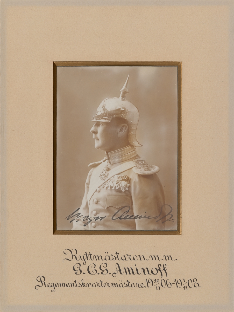 Porträtt av Grego Aminoff, ryttmästare vid Livgardet till häst K 1.