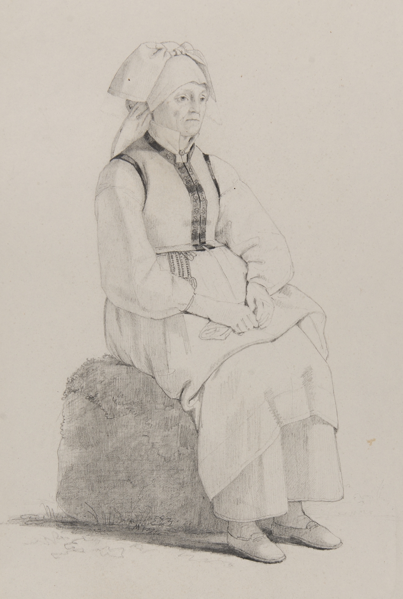 Märta Svensdotter från Wästra Wram Gierds Härad . Kvinna i helfigur sittande på en sten. Blyertsteckning i storformat av Otto Wallgren