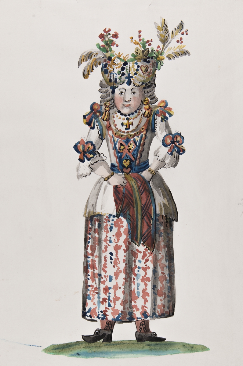 Dräkt. Akvarell i storformat "Brudpige dräkt på Fogdön, Åkers hd, Södermanland i början på 1800-talet. Akvarell af Charlotta Mörner 1760-1832. Kopierad af fröken E.v. Walterstorff 1913".