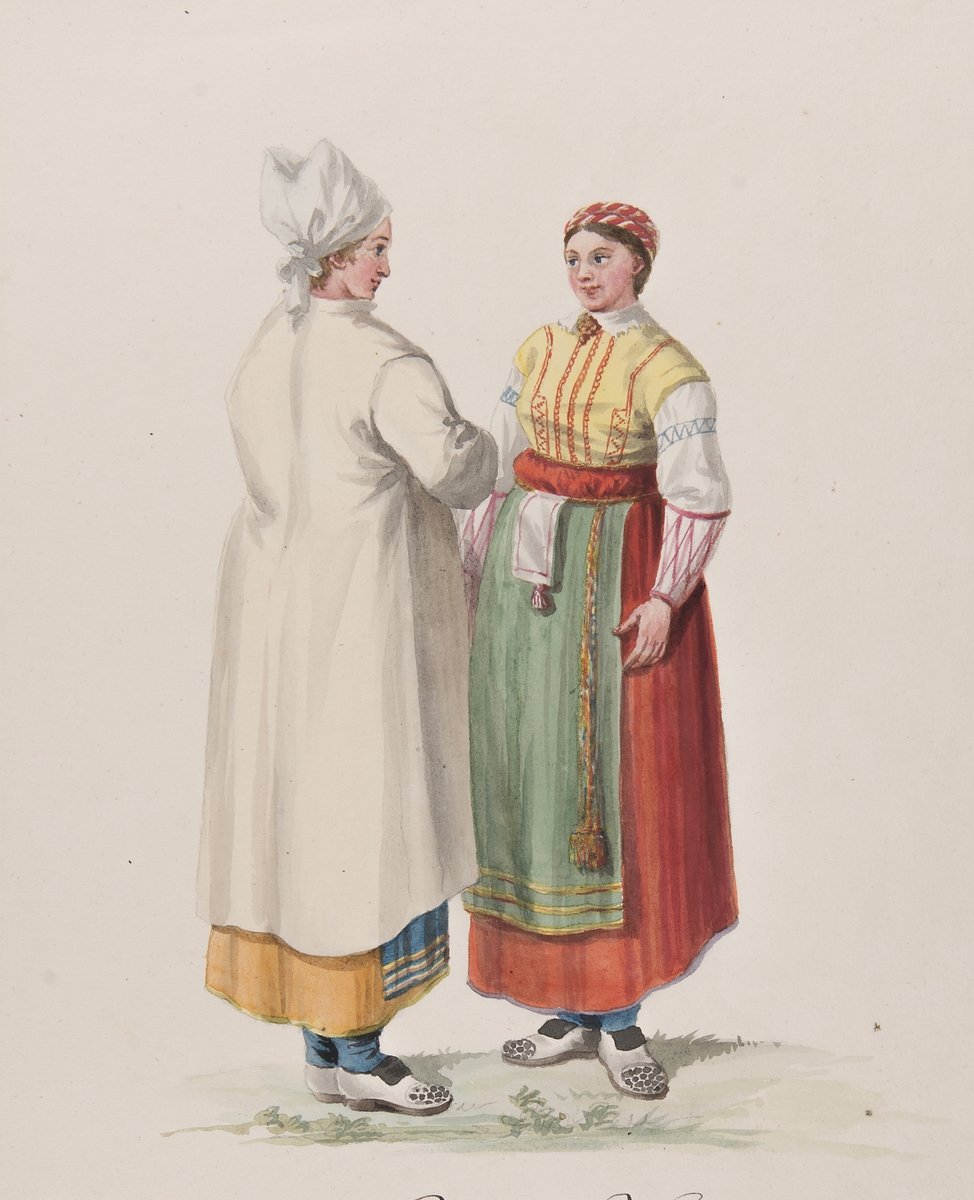 Dräkt. "Femmes de la Paroisse de Wingåker" Två kvinnor i dräkt. Akvarell i storformat av C.W. Swedman.