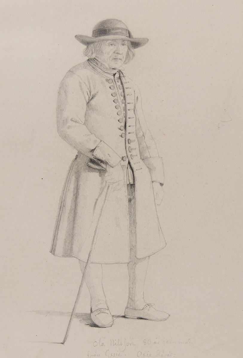 " No 1. Ola Nilson 80 år gammal. Från Gesie , Oxie härad" Blyertsteckning av man i dräkt med hatt o käpp i helfigur i storformat av Otto Wallgren