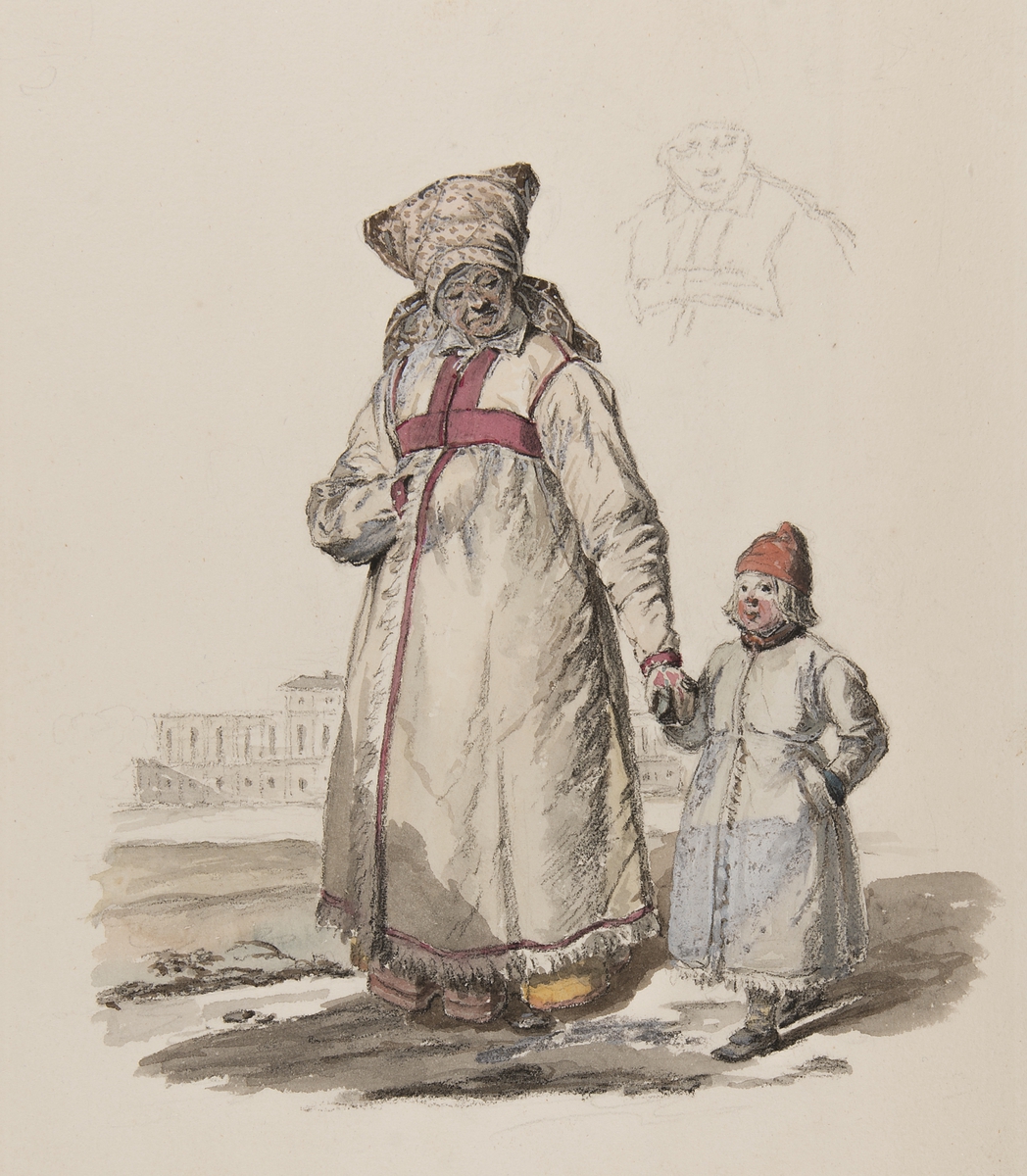 Dräkt. Kvinna med barn i helfigur. "Wingåkersboar uti vinterdräkt." Text på baksidan: "Vinterdräkt för kvinnor och barn, v. Vingåkers sn Oppunda hd, Södermanland. Akvarell af Johan Gustaf Sandberg (1782-1854) Nordiska museet 8050qb"