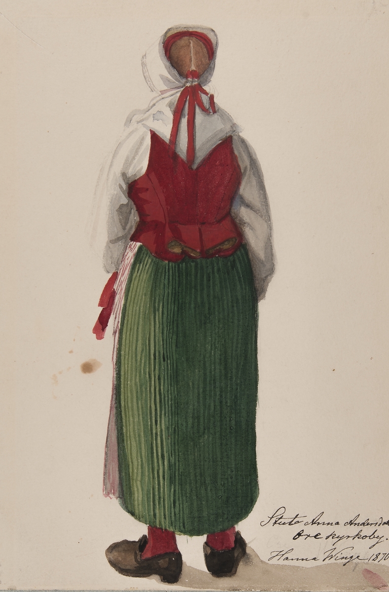 Stående kvinna bakifrån i helfigur. Ore kyrkoby, Ore sn. Akvarell av Hanna Winge 1870.