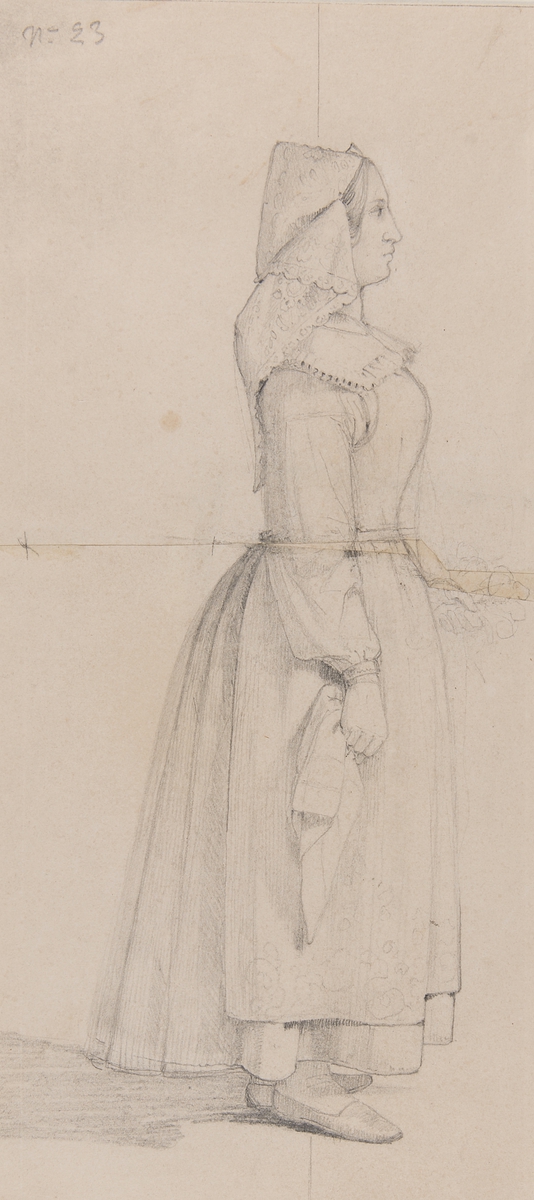 Kvinna i dräkt i helfigur i profil. Blyertsteckning i storformat av Otto Wallgren.