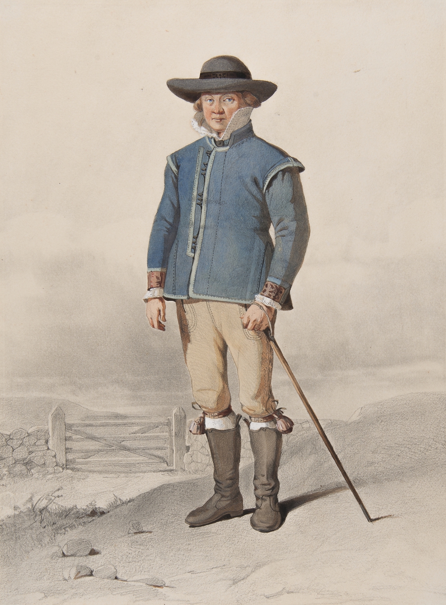 Akvallererad blyertsteckning. Stående man i helfigur med landskap i bakgrunden. Akvarell i storformat av Otto Wallgren