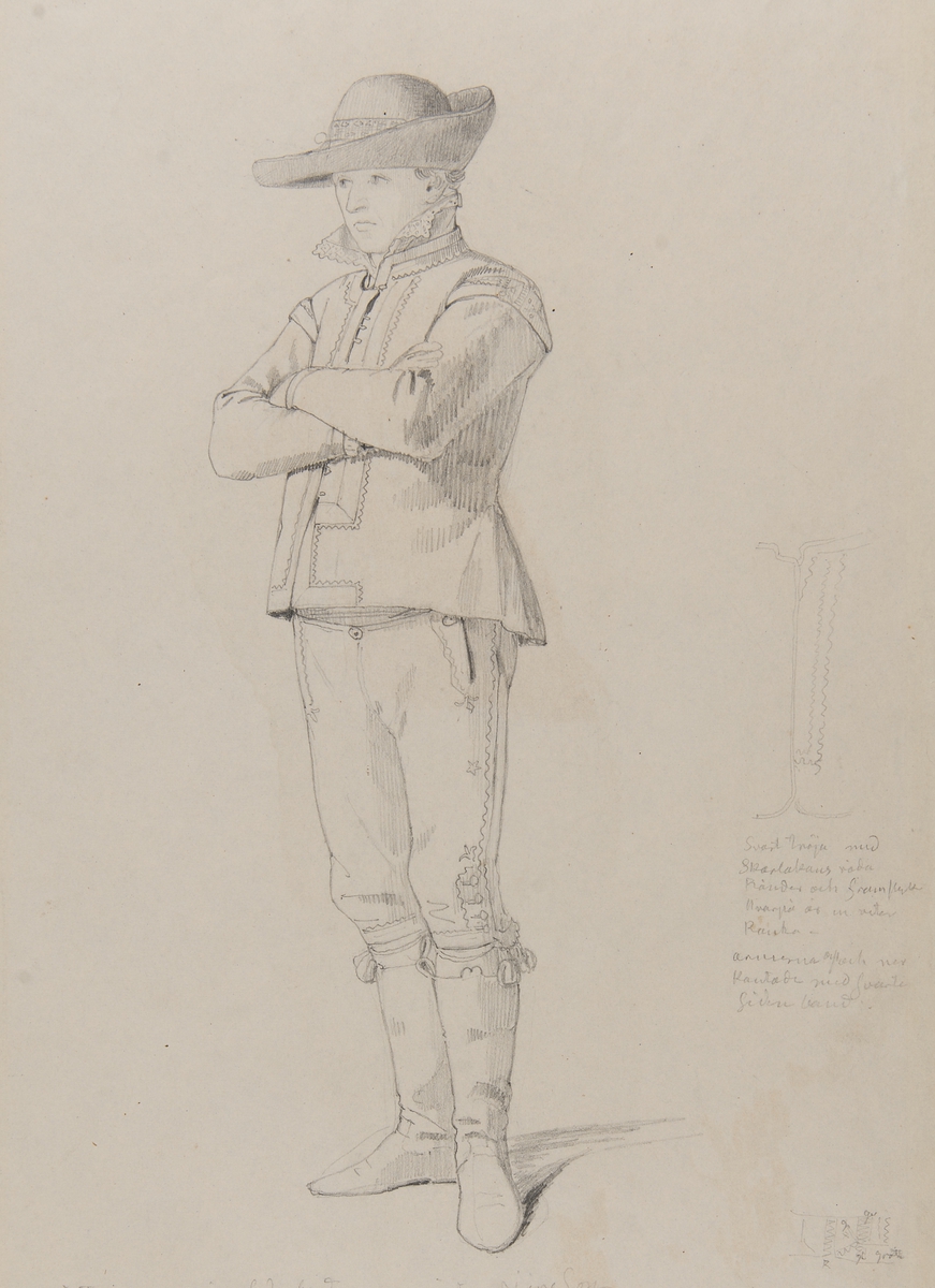 Blyertsteckning, Mårten Jönsson, Söfvestad, Herrestad, Herrestads härad i dräkt. Akvarell i storformat av Otto Wallgren