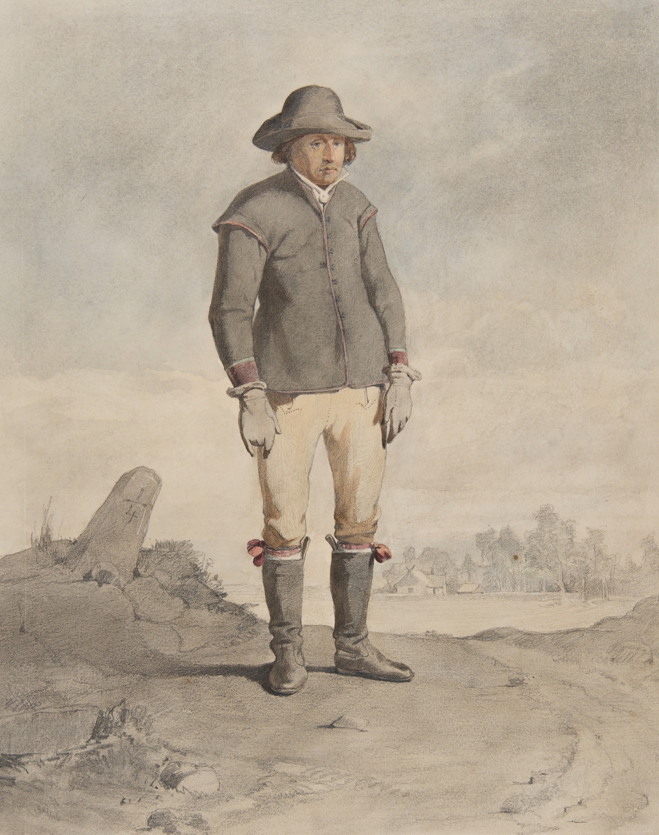 Bonde från Färs härad. Man i dräkt med sten i bakgrunden. Akvarellerad blyerstteckning i storformat av Otto Wallgren.