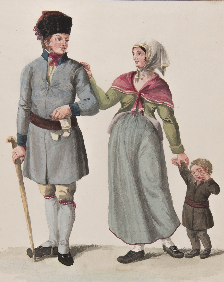 "Habitants de la Province de la Gestrikland", Tre personer en man en kvinna och ett barn i dräkt. Akvarell av C.W Swedman.