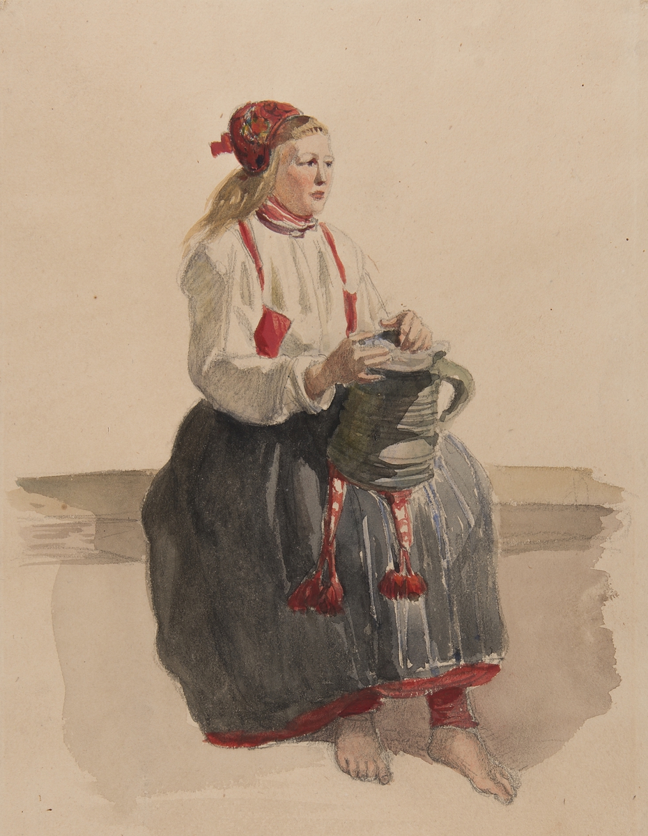 Ung kvinna i dräkt sittande i helfigur Akvarell av J.W. Wallander.