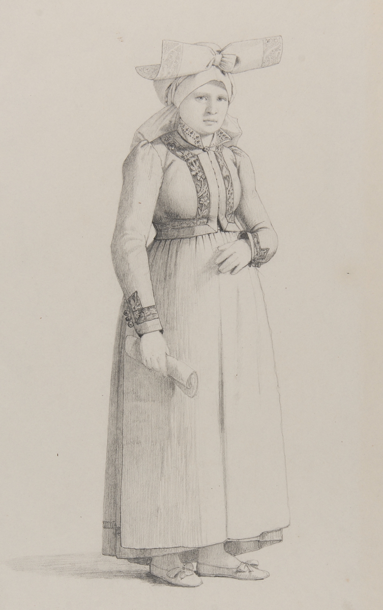 Anna Jöns Dotter från Brösarp, Albo Härad. Kvinna i dräkt, stående i helfigur Blyertsteckning av O.Wallgren