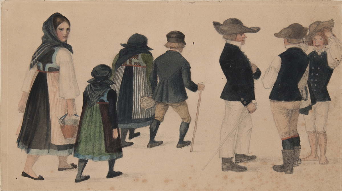Dräkt. Akvarell. Flera dräktklädda i sällskap, olika kön och ålder. En man är barfota. Akvarell av Brummer.