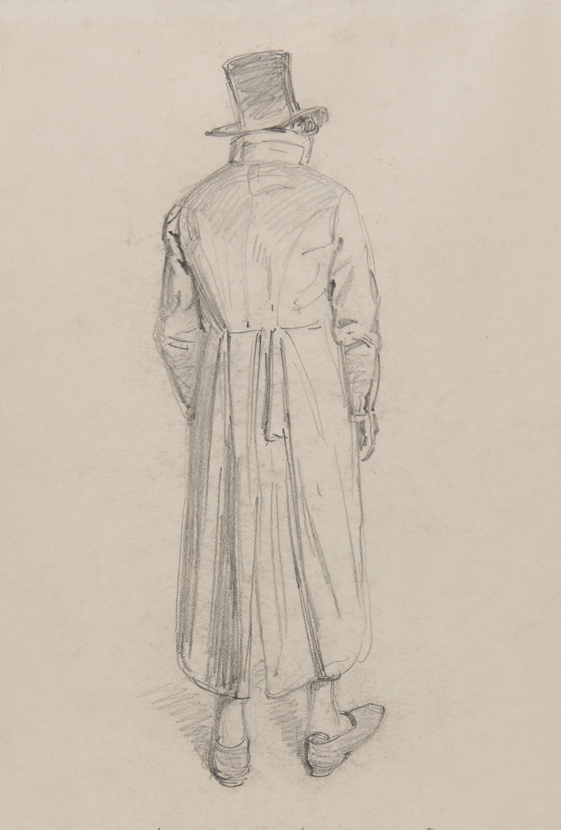 Dräkt. Man i helfigur bakifrån. Blyertsteckning i storformat av J.W. Wallander