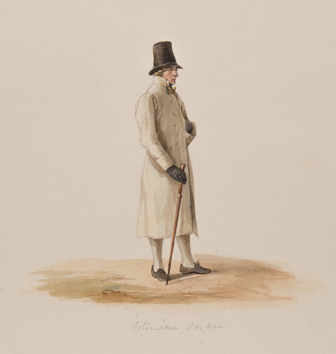 Dräkt. Man i vit rock med käpp. "Bonde från Österåkers sn, Oppunda hd, Södermanland, Akvarell av Johan Magnus Stäck (1812-1868)