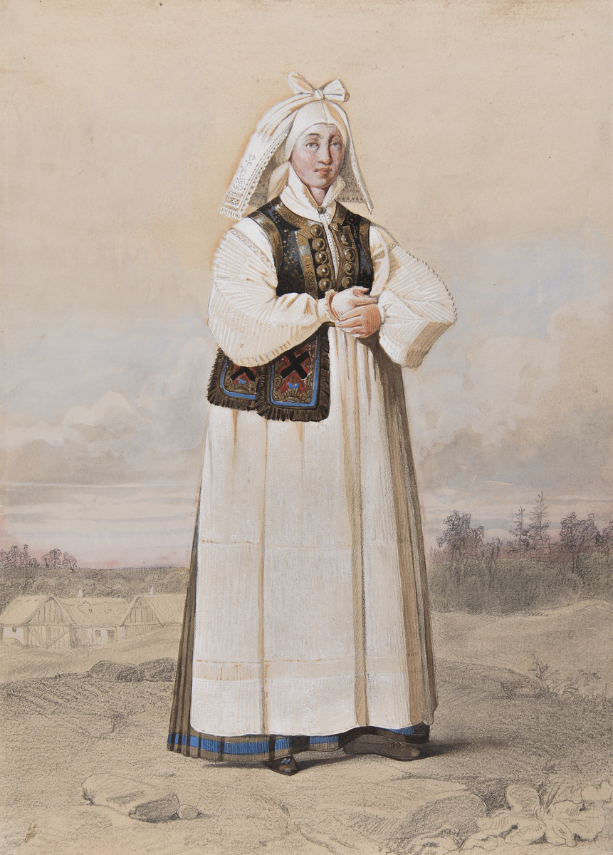Dräkt. Akvarellerad blyertsteckning av stående kvinna Akvarell i storformat av Otto Wallgren.