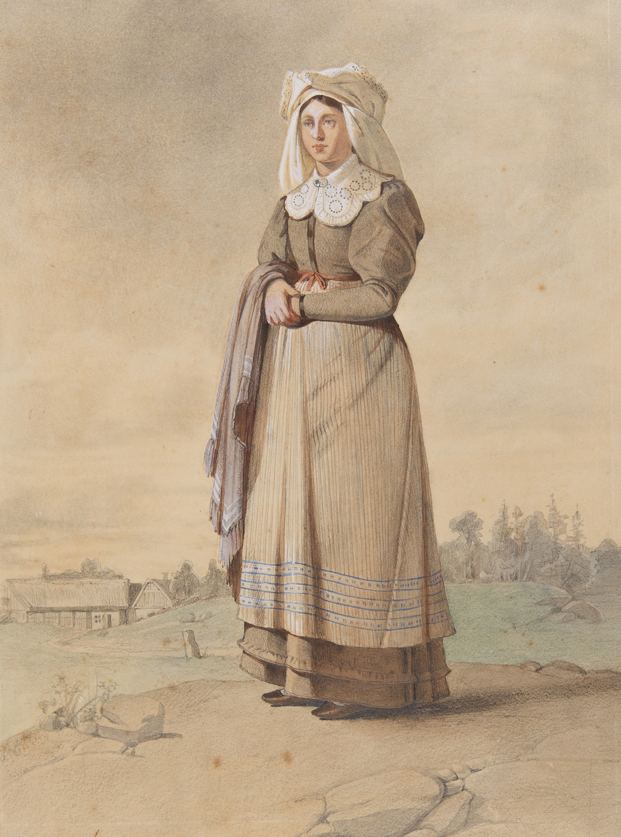 Akvallererad blyertsteckning av kivnna i dräkt , 1800-talets första hälft. Akvallererad blyertsteckning i storformat av Otto Wallgren