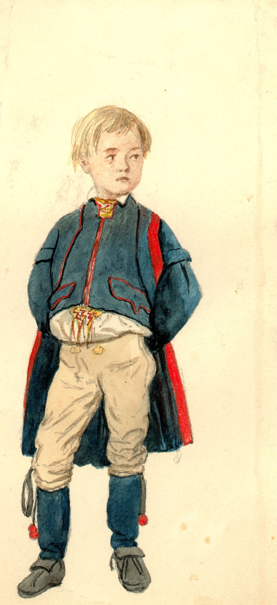 Folkdräkt; barn, pojke. Rättviks socken, Dalarna. Akvarell av A.J.G. Virgin. Inv nr 45595b.