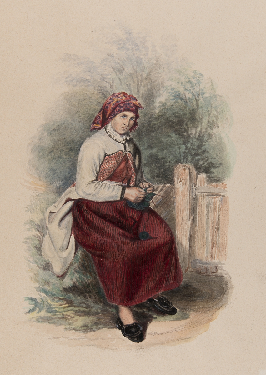 Dräkt. "Westra Wingåker, Hustrun Annika (vid Damsdal) Hvardags och resdrägt. Sittande, stickande kvinna i dräkt i helfigur. Akvarell i storformat av J.W. Wallander (kopia?)