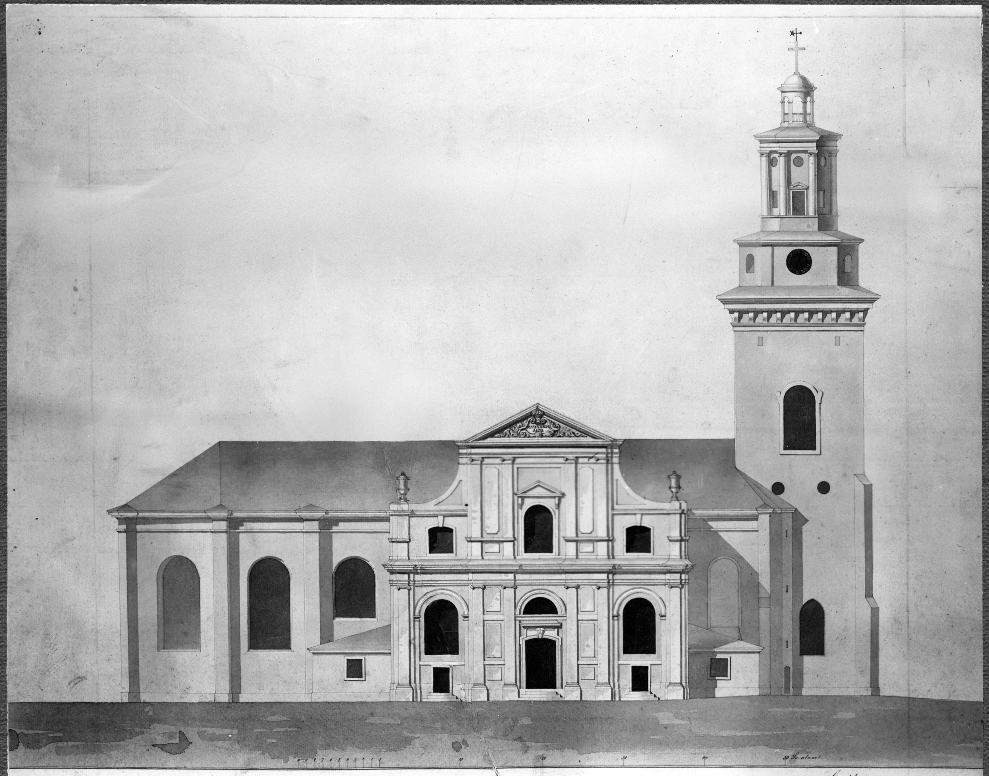 Ritning av kyrkans fasad mot norr 1848 av J. P. Lindberg. Avfotograferad.