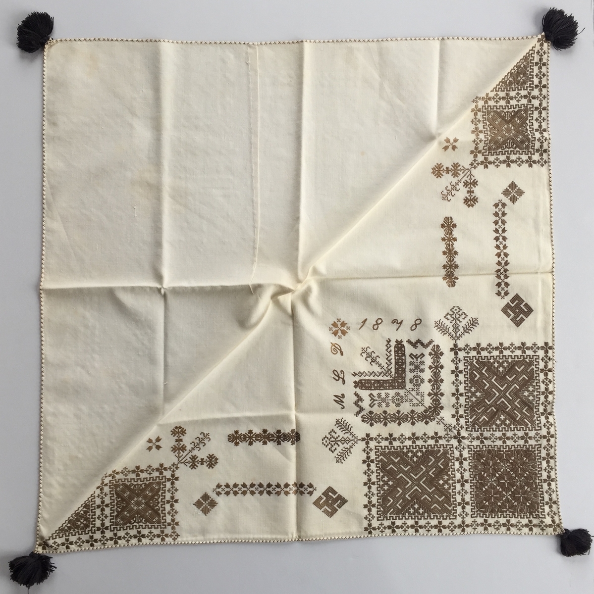 Blomsterinspirerat mönster i kvadrater i hörnen. Runt kvadraterna bård i blomstermotiv. Mellan kvadraterna på ryggsnibb och framsnibbar två bårder. På ryggsnibben tre kvadrater och en dekorerad majstångsspira. På varje framsnibb en kvadrat och en trekant.