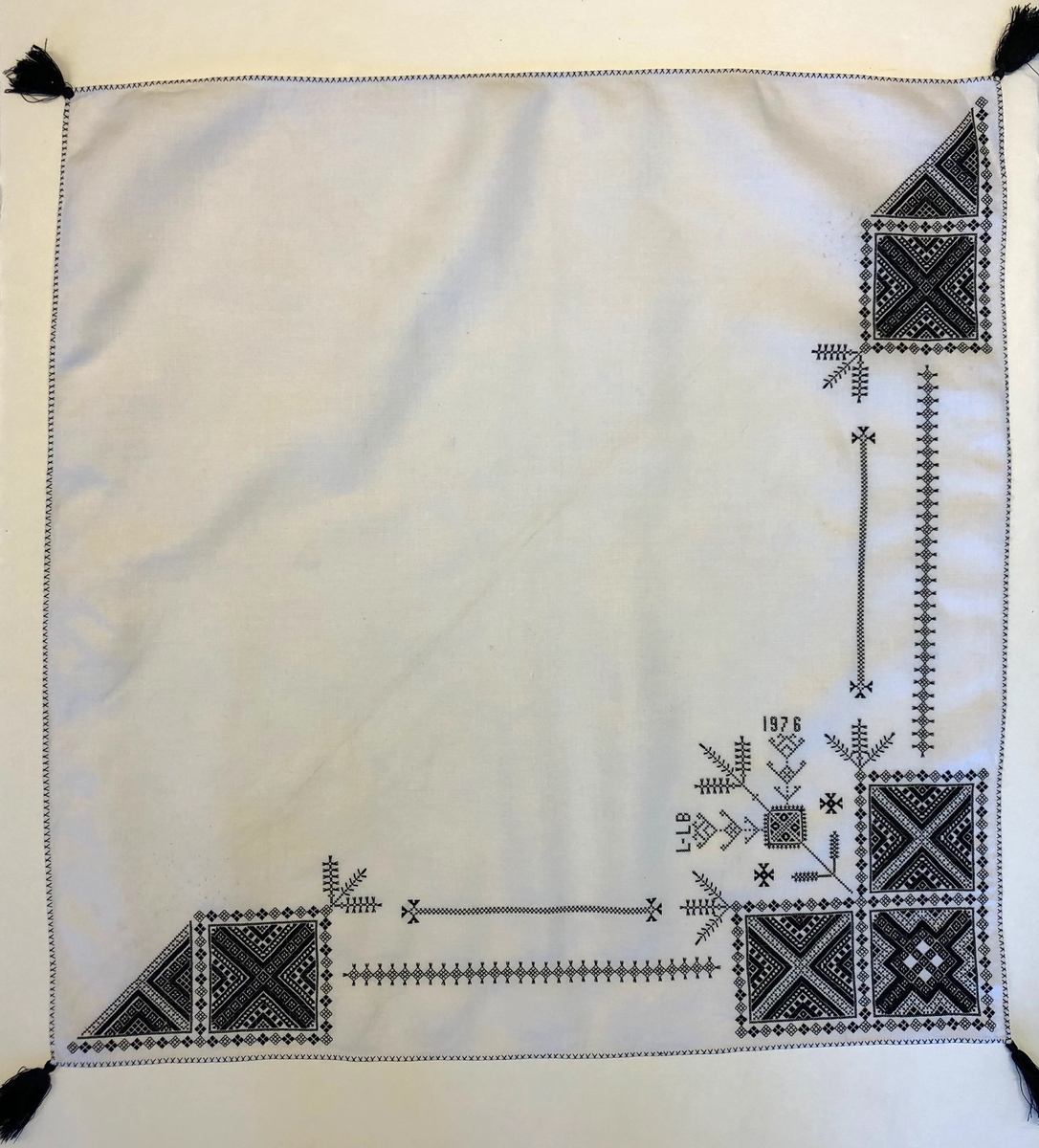 Geometriskt mönster i kvadrater i hörnen. Två bårder mellan kvadraterna på ryggsnibb och framsnibbar. På ryggsnibben tre kvadrater och en majstångsspira samt märkning med årtal och initialer. På varje framsnibb en kvadrat och en trekant.Två ornament