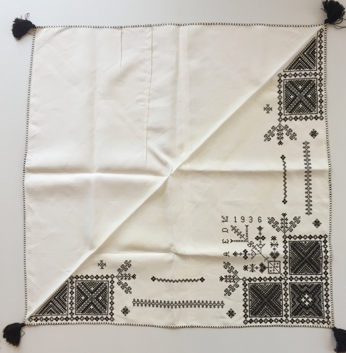 Titel: Geometriskt mönster i kvadrater i hörnen. Två bårder mellan kvadraterna på ryggsnibb och framsnibbar. På ryggsnibben tre kvadrater och en majstångsspira samt märkning med årtal och initialer. På varje framsnibb en kvadrat och en trekant. Sju ornament