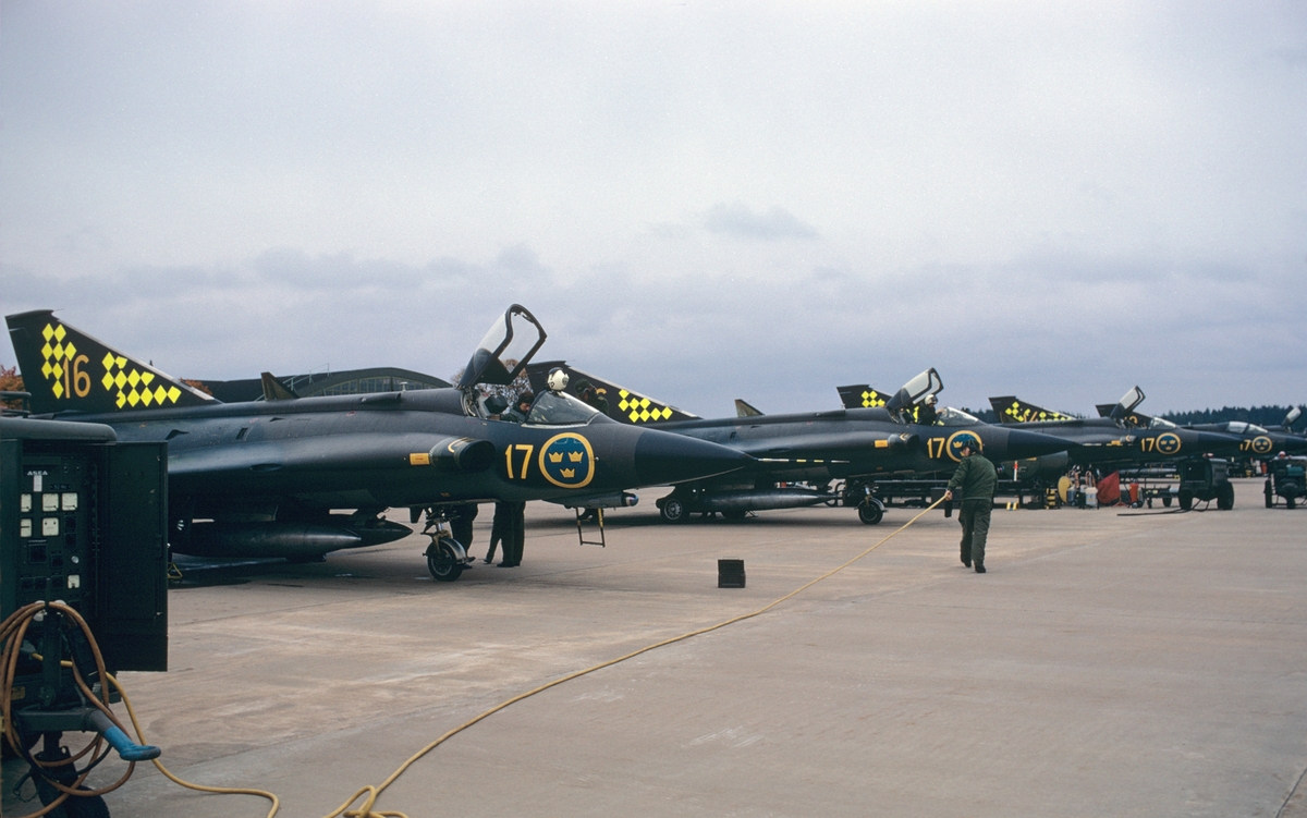 Klargöring av flygplan J 35 tillhörande F 17 Blekinge flygflottilj Malmens flygfält, hösten 1973. Serie om 3 bilder.